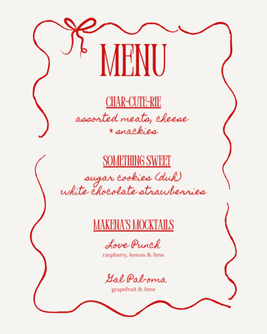I also prepped two signature mocktails for the evening which would be served in my favorite Lunette champagne flutes by Crate & Barrel. A Love Punch, featuring raspberry sorbet and lemon-lime soda, and the Gal Pal-oma, a fun infusion of grapefruit and lime juice with club soda. Thanks to a little help from Canva, I created an adorable menu and itinerary to tie the whole tablescape together.
